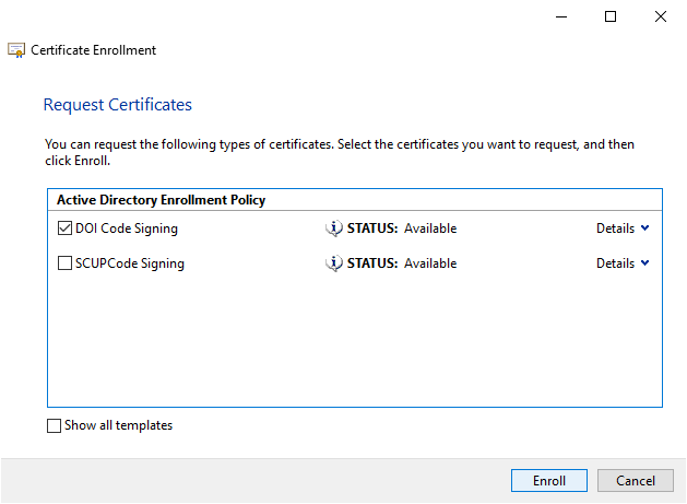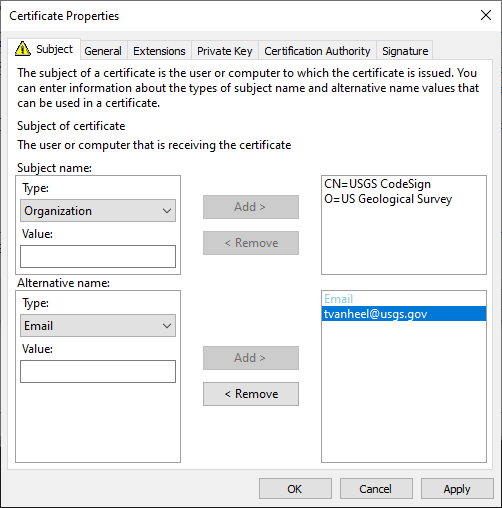 To generate a signing certificate the developer will submit a request to the USGS Service desk asking to be added to the Code Signing security group.